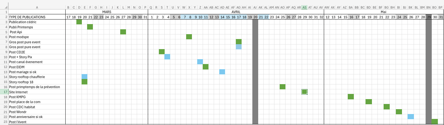 Chaque ligne du tableau correspond à un type de publication (événement, témoignage, partenariat, contenu technique, story immersive...), et les cases colorées indiquent les dates prévues de diffusion. Ce fonctionnement a renforcé l'impact de notre communication, tout en facilitant la coordination entre les équipes créatives, opérationnelles et stratégiques.