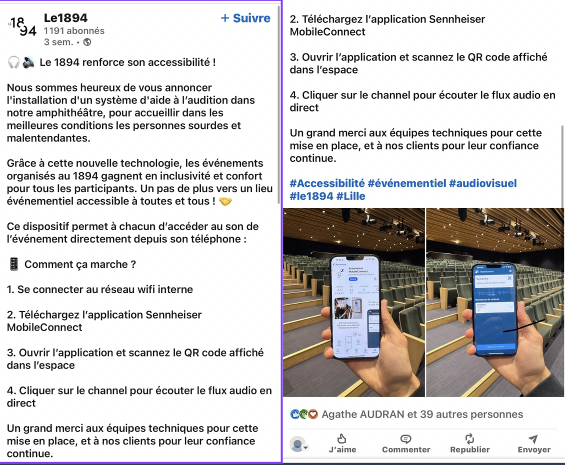Un post mettant en avant l'accessibilité du 1894, grâce à l'installation d'un système auditif pour les personnes malentendantes.