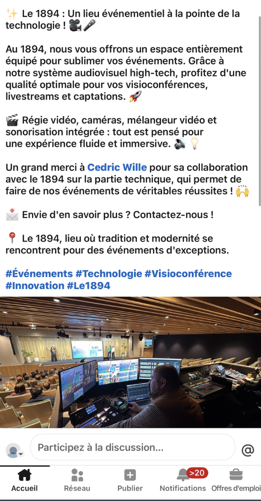 Une part importante de mes actions a concerné Le 1894, qui bénéficie d'une activité plus régulière et d'un positionnement solide dans l'événementiel professionnel. Ce lieu accueillant de nombreux événements, les opportunités de communication étaient plus fréquentes.