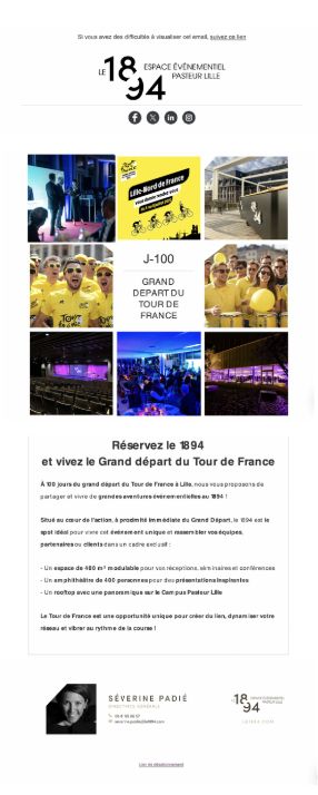 La première, envoyée à J-100 du Tour de France, mettait en avant le 1894 comme un lieu idéal pour accueillir des événements liés à cette actualité, grâce à sa localisation et ses équipements.