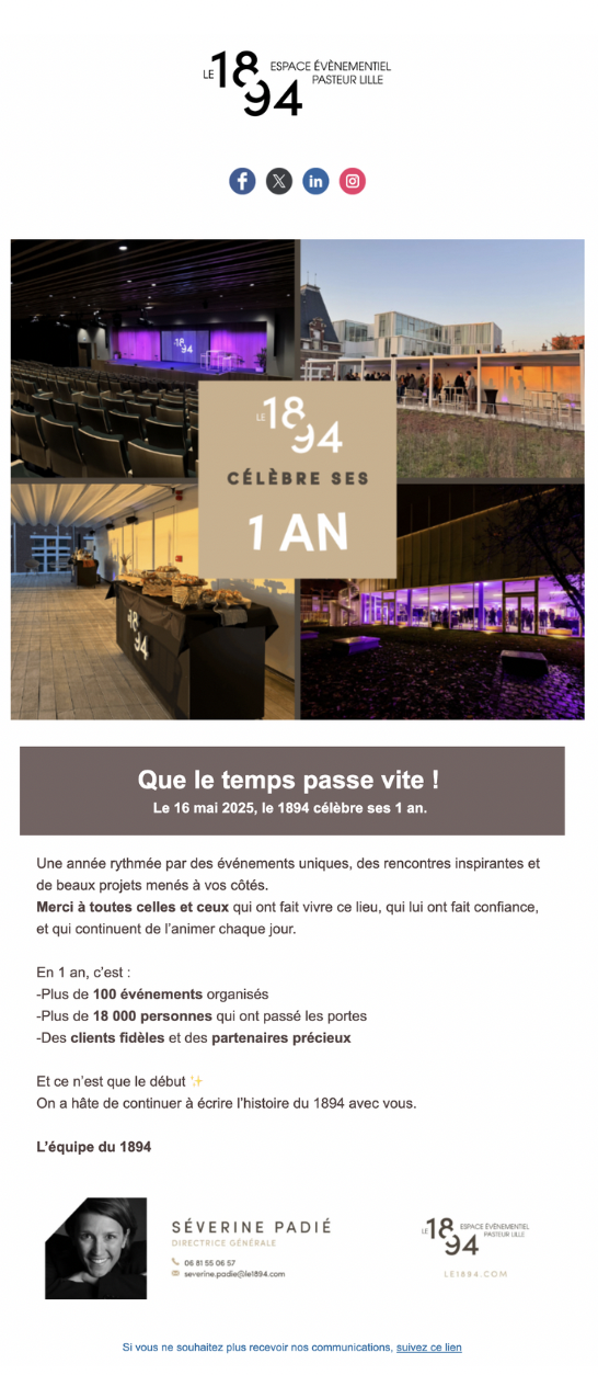 La seconde célébrait les 1 an du 1894, en valorisant les chiffres clés de l'année écoulée (100 événements, 18 000 visiteurs) et en remerciant les clients et partenaires.